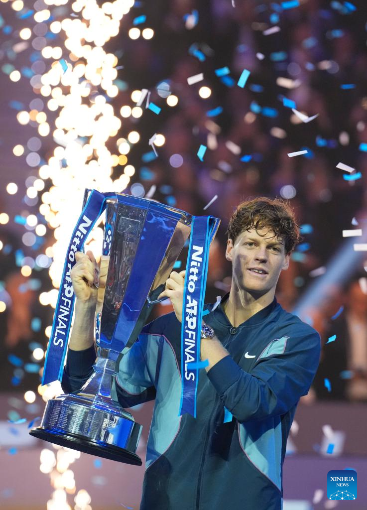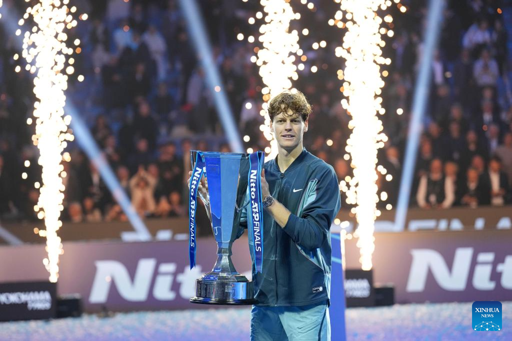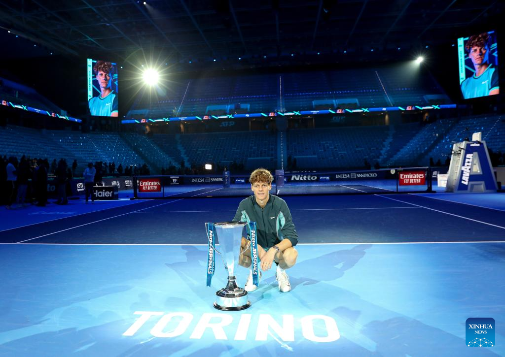 Winner Jannik Sinner of Italy poses with the trophy after winning the men's singles final match against Taylor Fritz of the United States at the ATP Finals in Turin, Italy, on Nov. 17, 2024. (Xinhua/Li Jing)