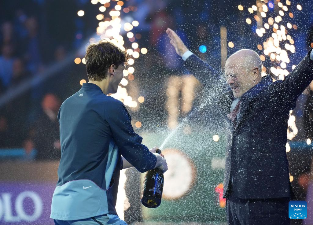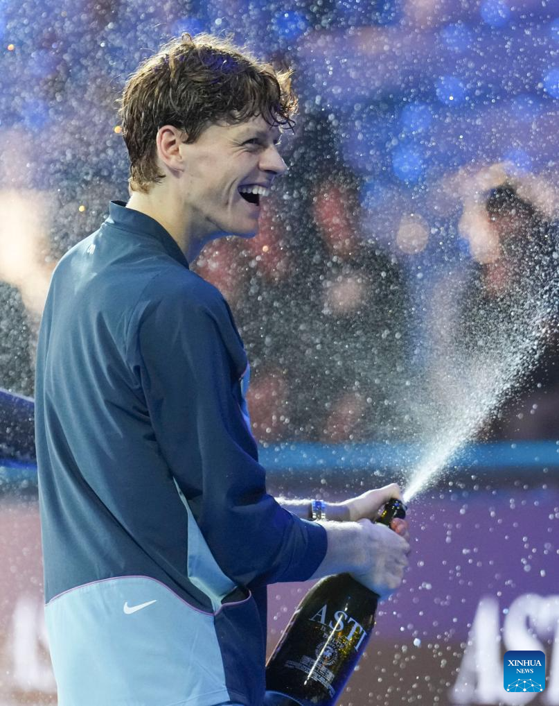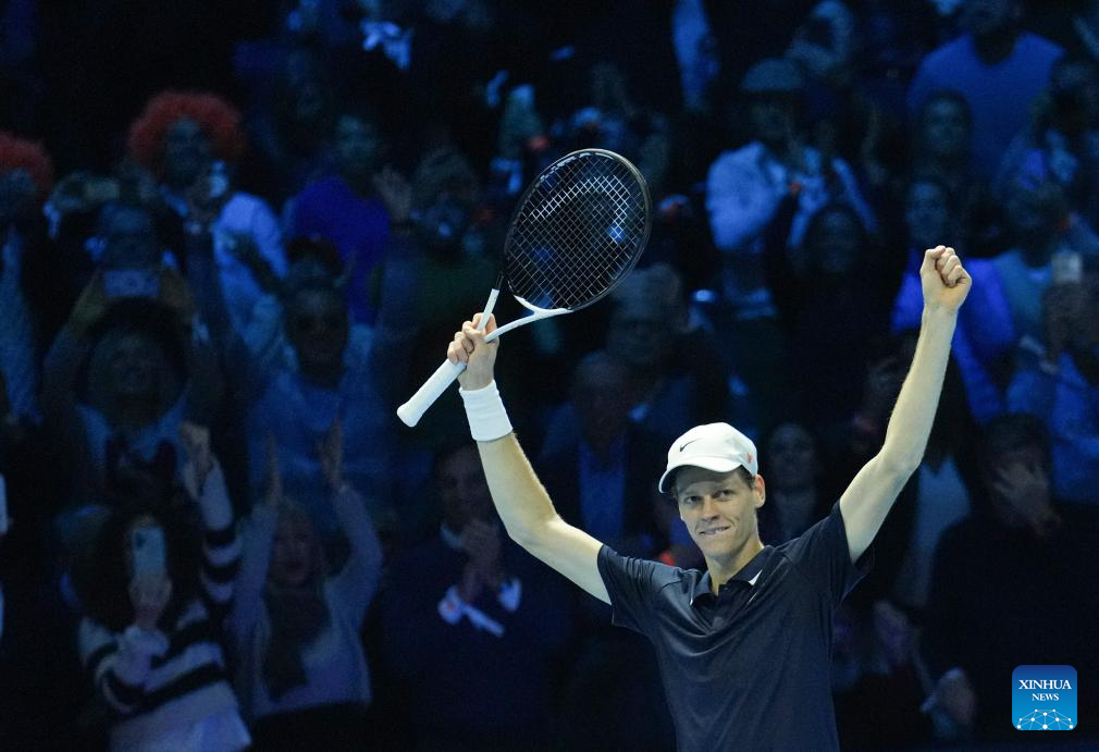 Jannik Sinner of Italy celebrates after winning the men's singles final match against Taylor Fritz of the United States at the ATP Finals in Turin, Italy, on Nov. 17, 2024. (Xinhua/Li Jing)