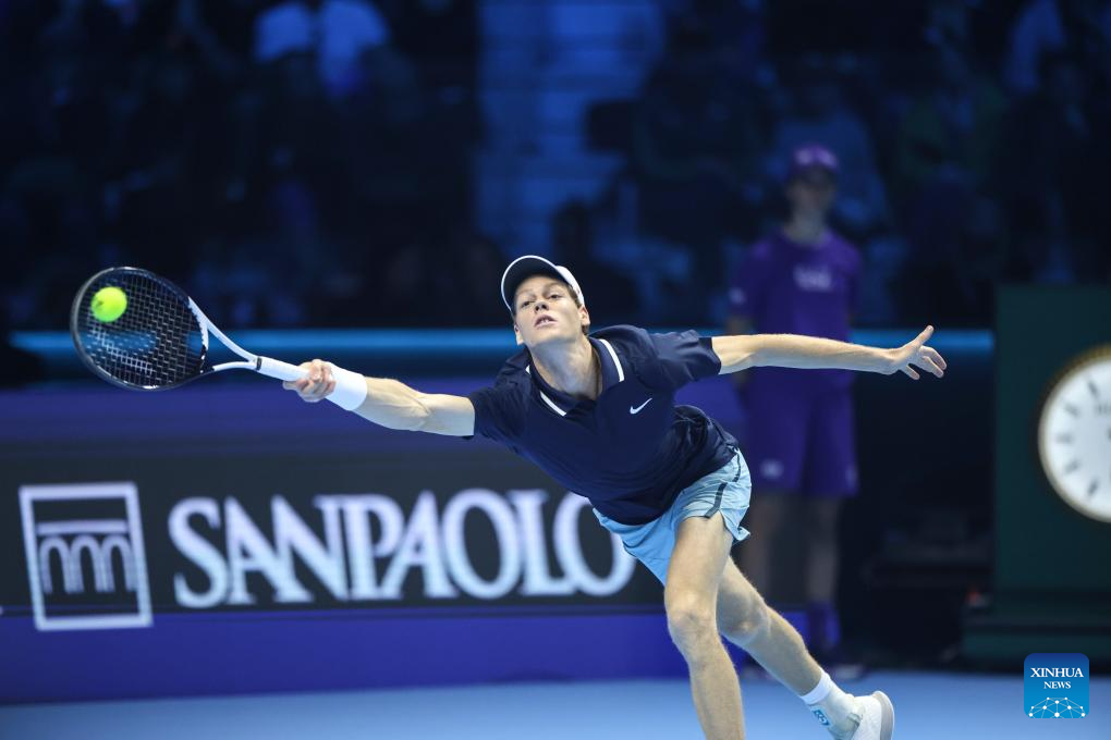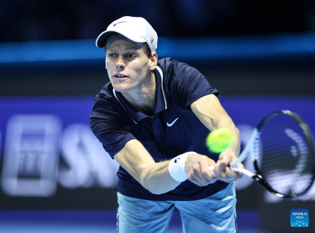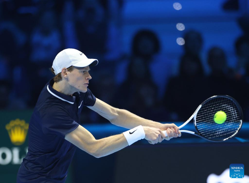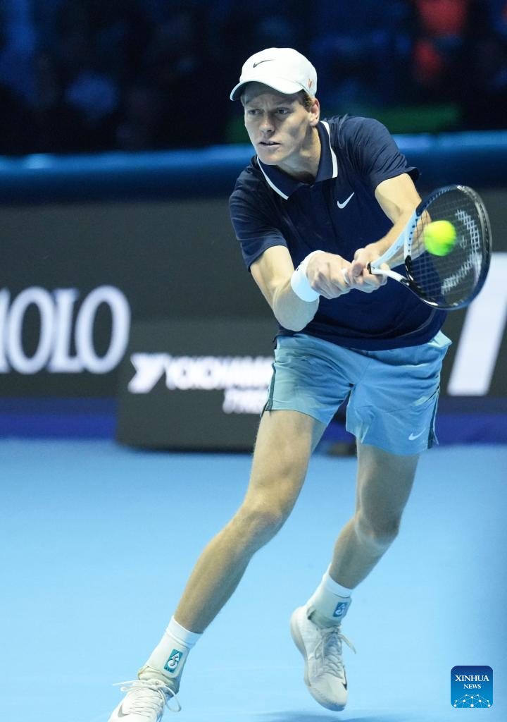 Jannik Sinner of Italy hits a return during the men's singles final match against Taylor Fritz of the United States at the ATP Finals in Turin, Italy, on Nov. 17, 2024. (Xinhua/Li Jing)
