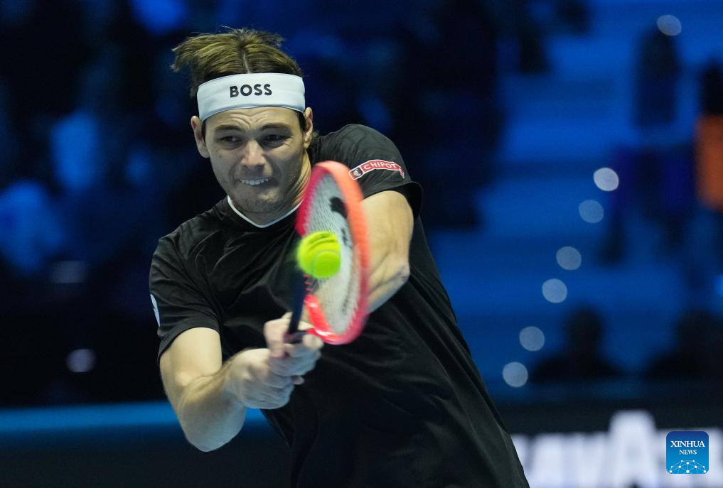 Taylor Fritz of the United States hits a return during the men's singles final match against against Jannik Sinner of Italy at the ATP Finals in Turin, Italy, on Nov. 17, 2024. (Xinhua/Li Jing)