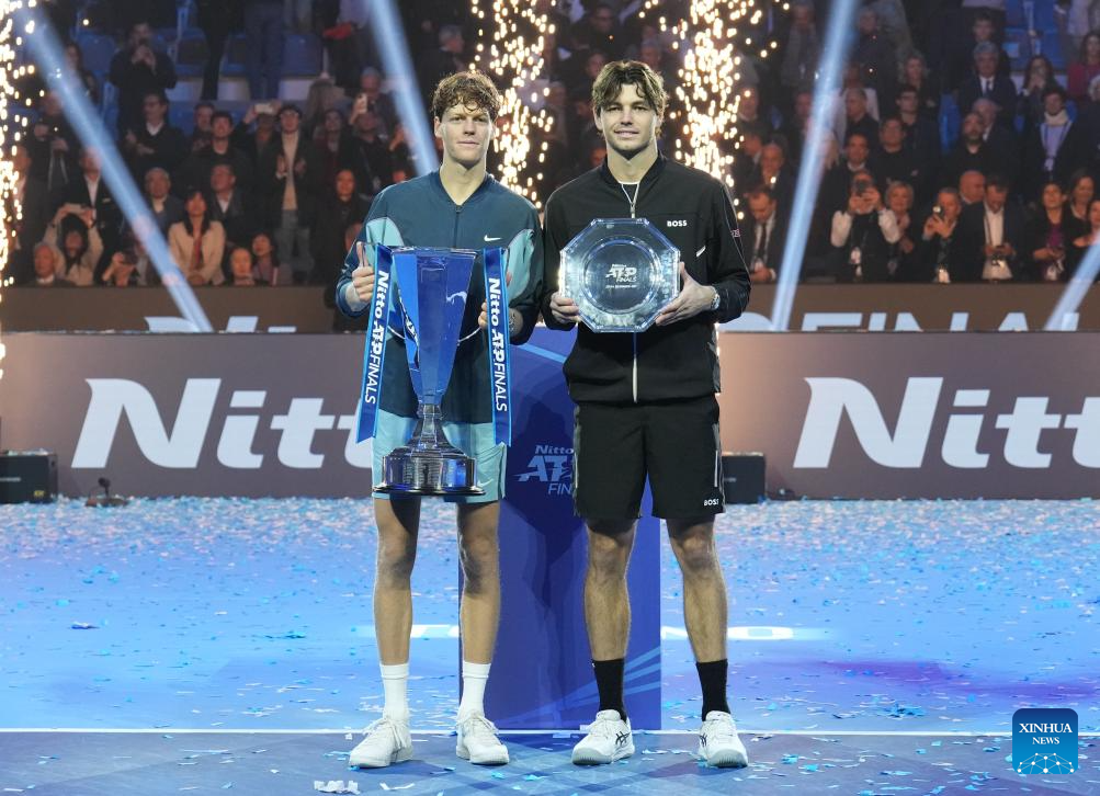Winner Jannik Sinner (L) of Italy and runner-up Taylor Fritz of the United States pose after the men's singles final match at the ATP Finals in Turin, Italy, on Nov. 17, 2024. (Xinhua/Li Jing)