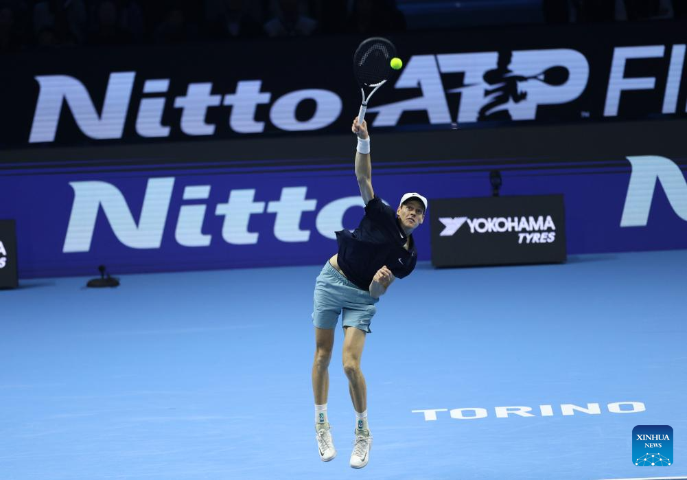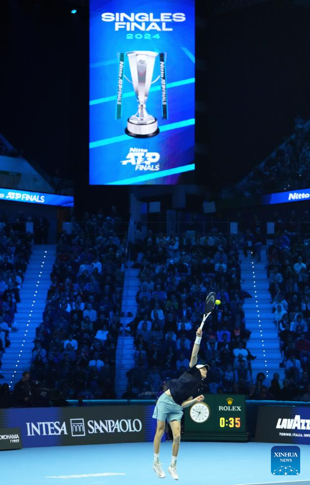Jannik Sinner of Italy serves during the men's singles final match against Taylor Fritz of the United States at the ATP Finals in Turin, Italy, on Nov. 17, 2024. (Xinhua/Li Jing)
