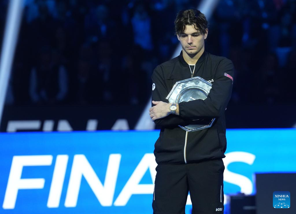 Runner-up Taylor Fritz of the United States reacts during the awarding ceremony after the men's singles final match against Jannik Sinner of Italy at the ATP Finals in Turin, Italy, on Nov. 17, 2024. (Xinhua/Li Jing)