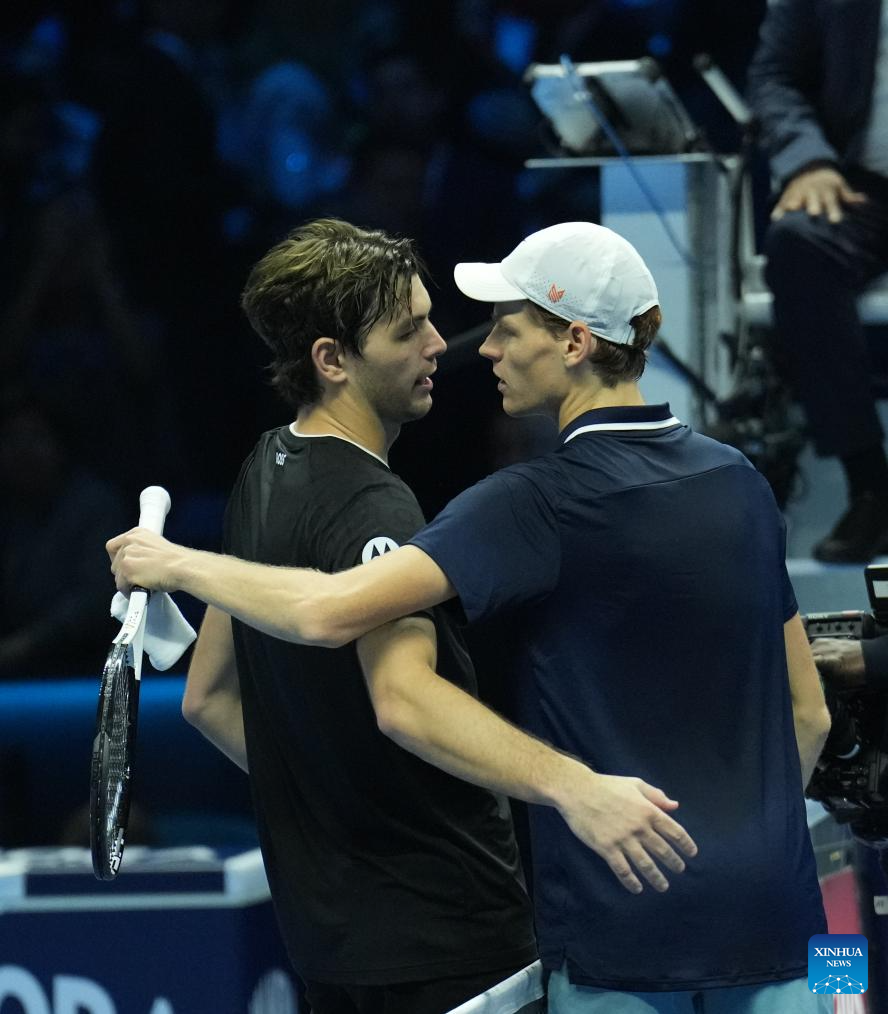 Jannik Sinner (R) of Italy is congratulated by Taylor Fritz of the United States after the men's singles final match at the ATP Finals in Turin, Italy, on Nov. 17, 2024. (Xinhua/Li Jing)