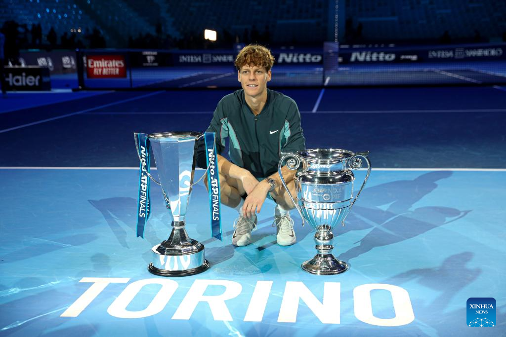 Jannik Sinner of Italy poses with the trophies of the ATP Finals and ATP Year-End No.1 after winning the men's singles final match against Taylor Fritz of the United States at the ATP Finals in Turin, Italy, on Nov. 17, 2024. (Xinhua/Li Jing)