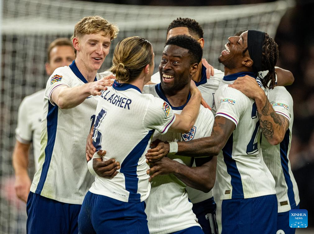 Conor Gallagher (3rd L) of England celebrates with teammates after scoring during the UEFA Nations League League B football match between England and the Republic of Ireland in London, England, on Nov. 17, 2024. (Xinhua)
