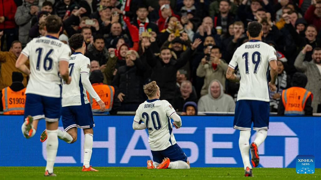 Jarrod Bowen (R) of England celebrates after scoring during the UEFA Nations League League B football match between England and the Republic of Ireland in London, England, on Nov. 17, 2024. (Xinhua)