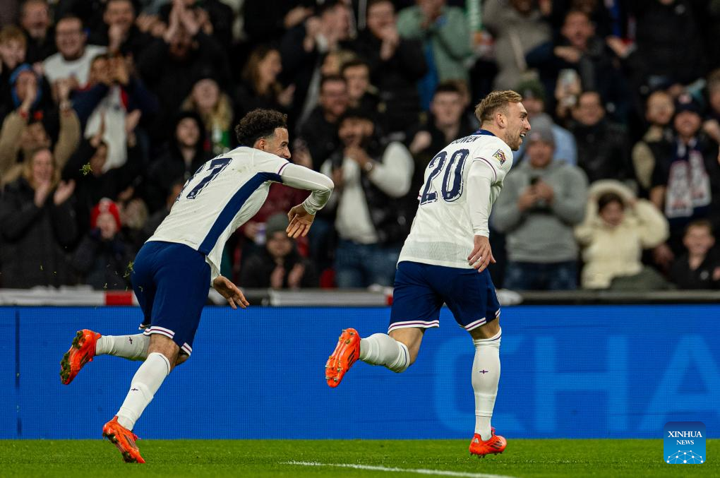 Taylor Harwood-Bellis (R) of England celebrates after scoring during the UEFA Nations League League B football match between England and the Republic of Ireland in London, England, on Nov. 17, 2024. (Xinhua)