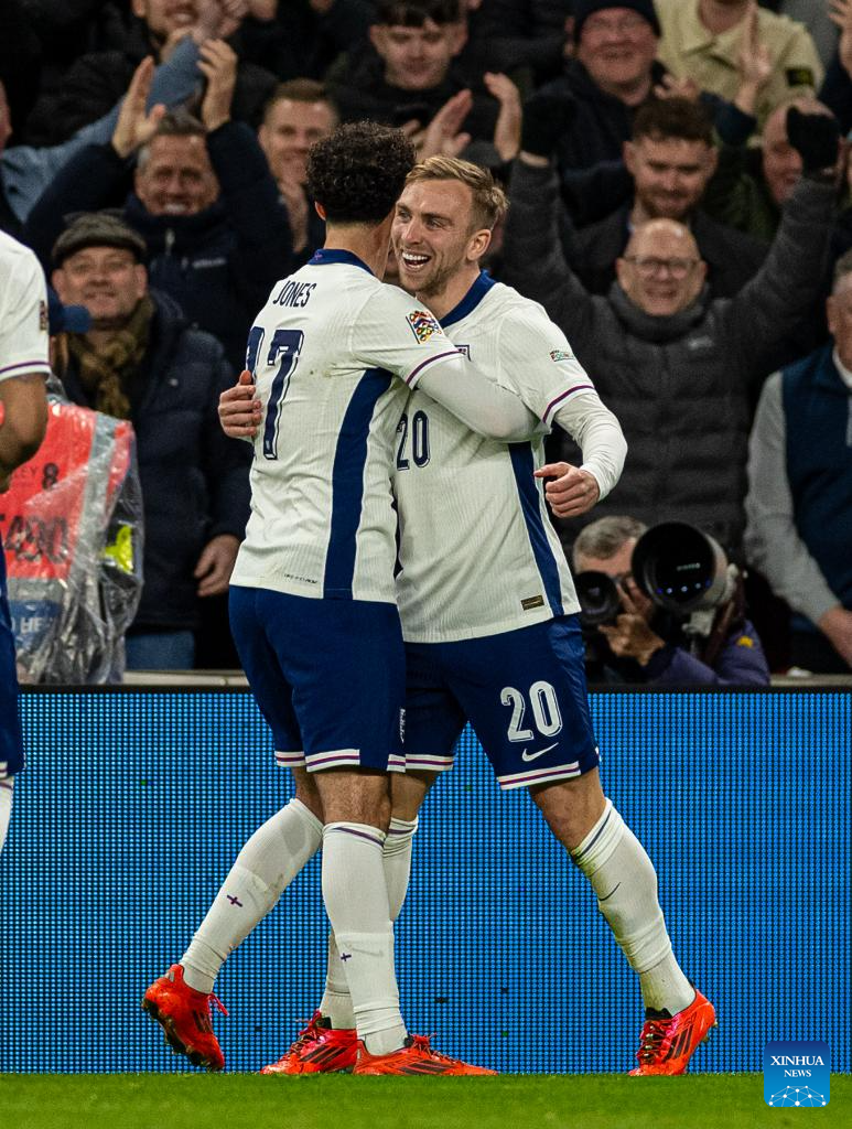 Jarrod Bowen (R) celebrates with Curtis Jones of England after scoring during the UEFA Nations League League B football match between England and the Republic of Ireland in London, England, on Nov. 17, 2024. (Xinhua)