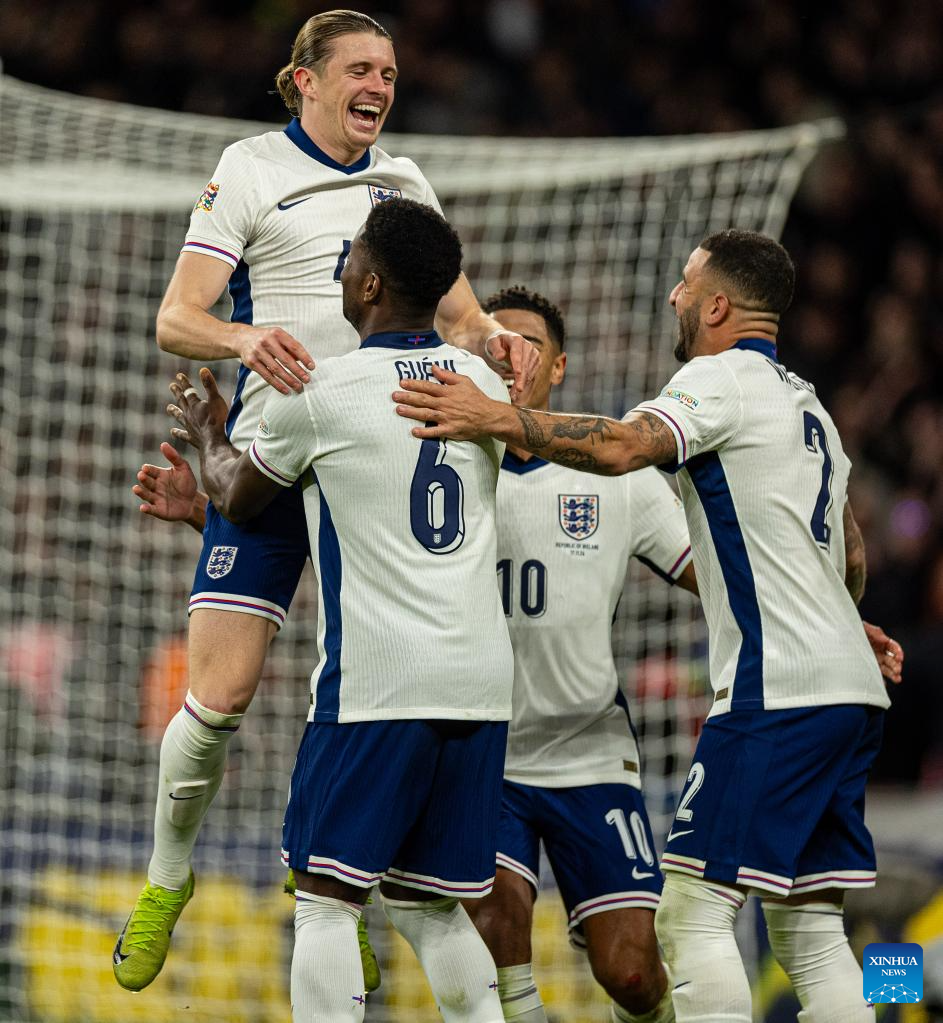 Conor Gallagher (Top) of England celebrates after scoring during the UEFA Nations League League B football match between England and the Republic of Ireland in London, England, on Nov. 17, 2024. (Xinhua)