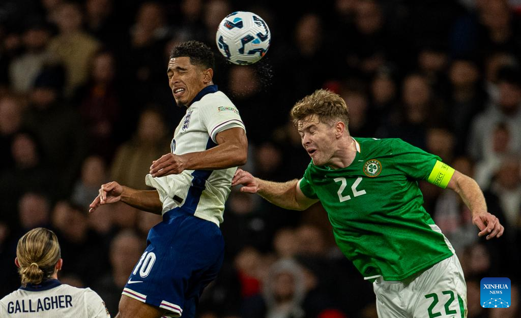 Jude Bellingham (L) of England and Nathan Collins of the Republic of Ireland head for the ball during the UEFA Nations League League B football match between England and the Republic of Ireland in London, England, on Nov. 17, 2024. (Xinhua)