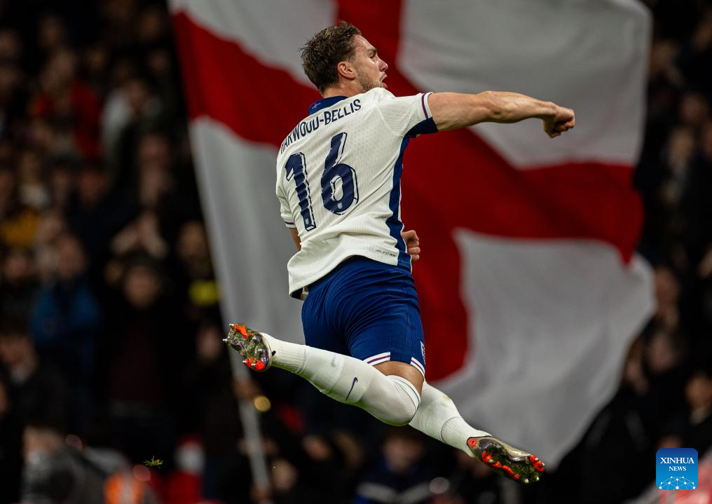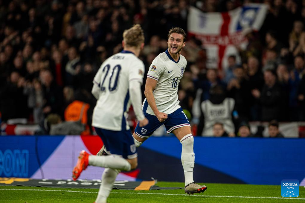 Taylor Harwood-Bellis of England celebrates after scoring during the UEFA Nations League League B football match between England and the Republic of Ireland in London, England, on Nov. 17, 2024. (Xinhua)