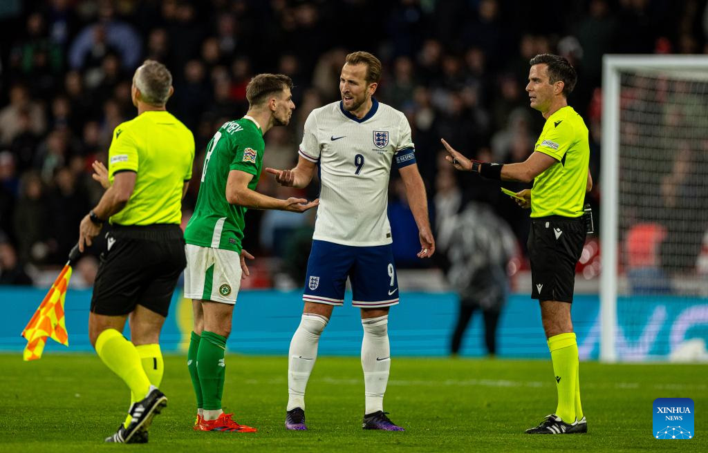 Jayson Molumby (2nd L) of the Republic of Ireland argues with Harry Kane (2nd R) of England during the UEFA Nations League League B football match between England and the Republic of Ireland in London, England, on Nov. 17, 2024. (Xinhua)