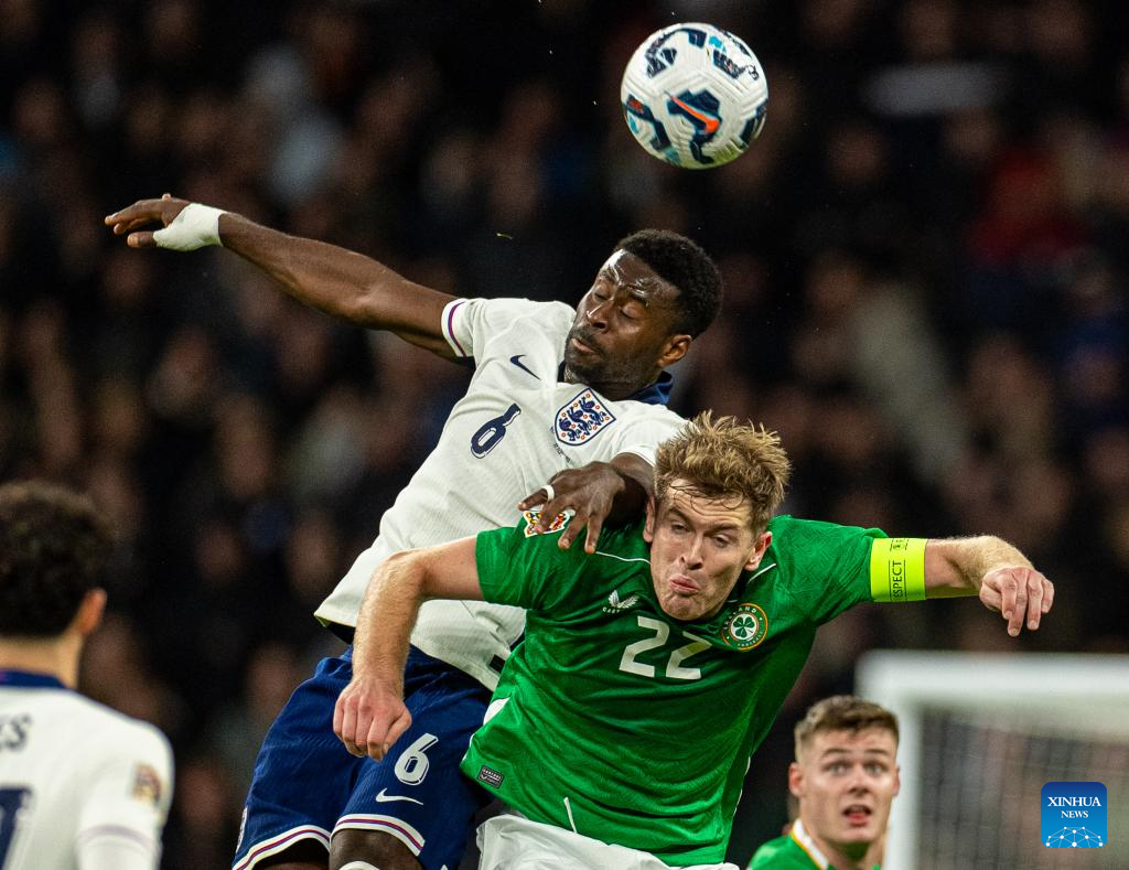 Marc Guehi (L) of England and Nathan Collins of Republic of Ireland head for the ball during the UEFA Nations League League B football match between England and the Republic of Ireland in London, England, on Nov. 17, 2024. (Xinhua)