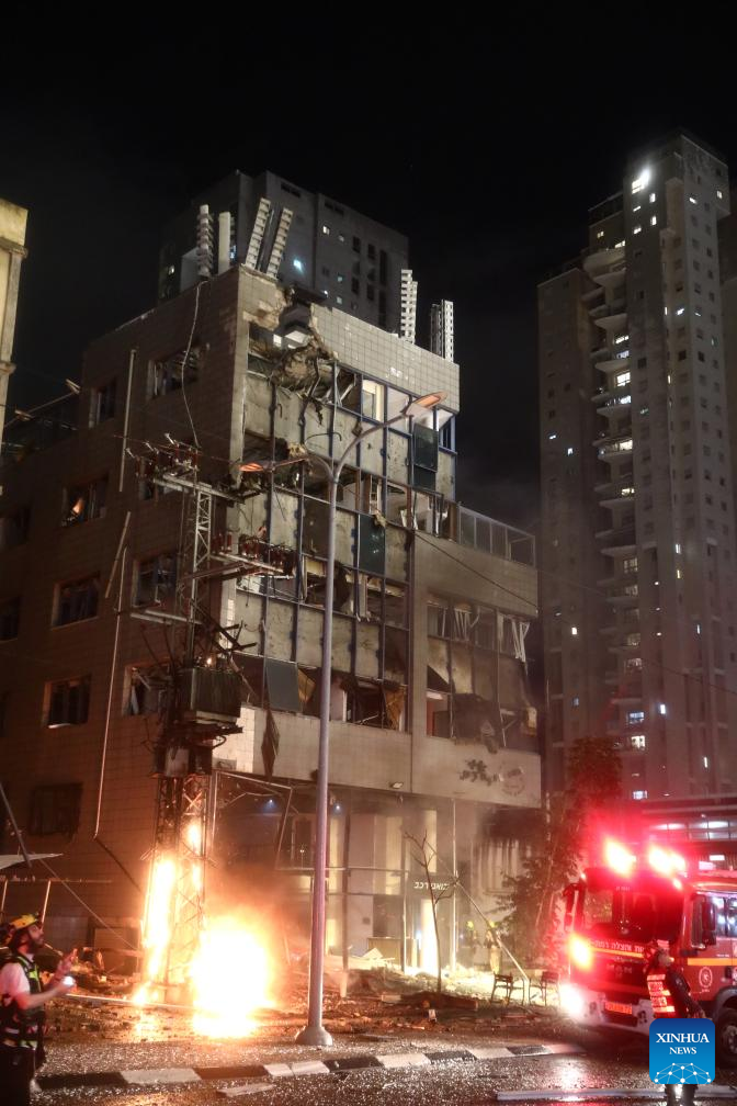 Video footage on social media showed a bus and a high-voltage power line catching fire in Ramat Gan, a suburb of Tel Aviv. An office building in the area was also damaged.
