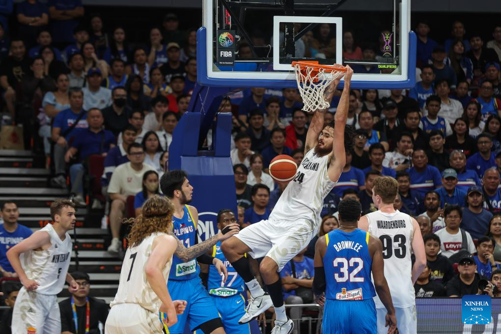 Tyrell Harrison (top) of New Zealand dunks during the match between New Zealand and the Philippines at the FIBA Asia Cup 2025 Qualifiers in Pasay City, the Philippines on Nov. 21, 2024. (Xinhua/Rouelle Umali)