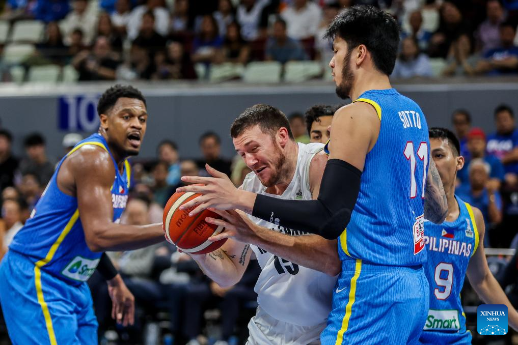 Thomas Vodanovich (C) of New Zealand breaks through during the match between New Zealand and the Philippines at the FIBA Asia Cup 2025 Qualifiers in Pasay City, the Philippines on Nov. 21, 2024. (Xinhua/Rouelle Umali)