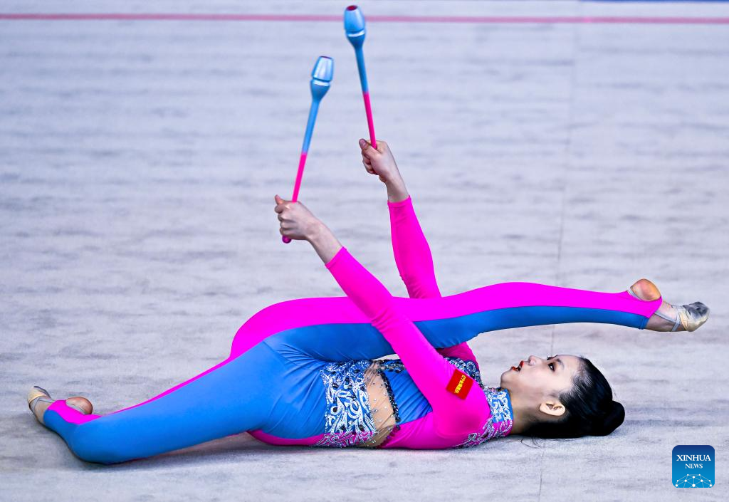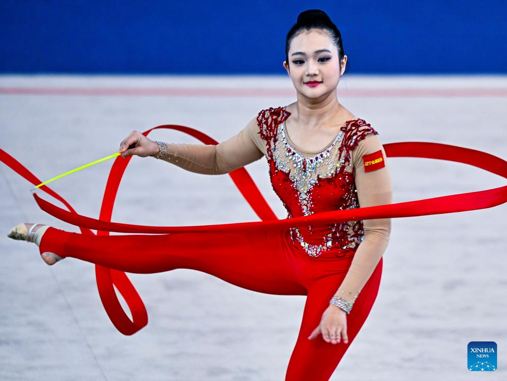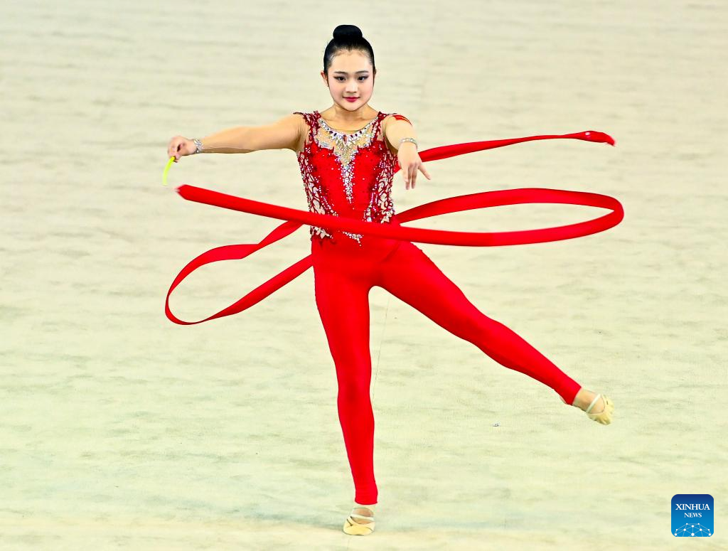 Cheng Xiyuan of China competes during the individual all-around qualifications at the 2024 International Rhythmic Gymnastics Tournament in Doha, Qatar, on Nov. 21, 2024. (Photo by Nikku/Xinhua)