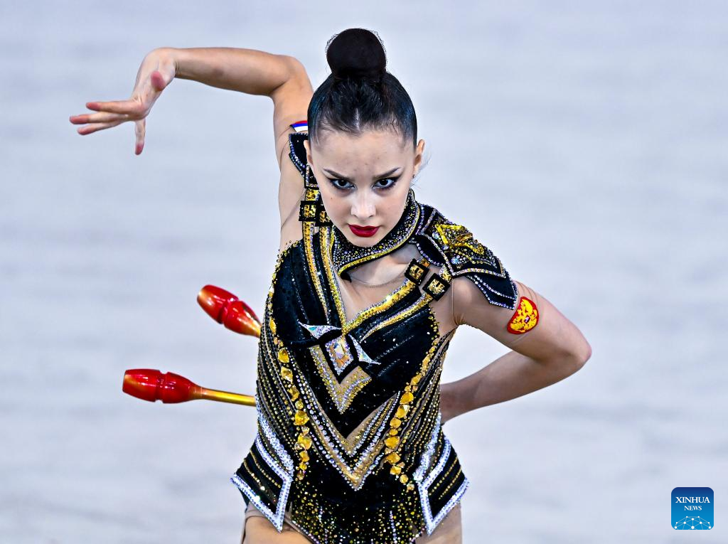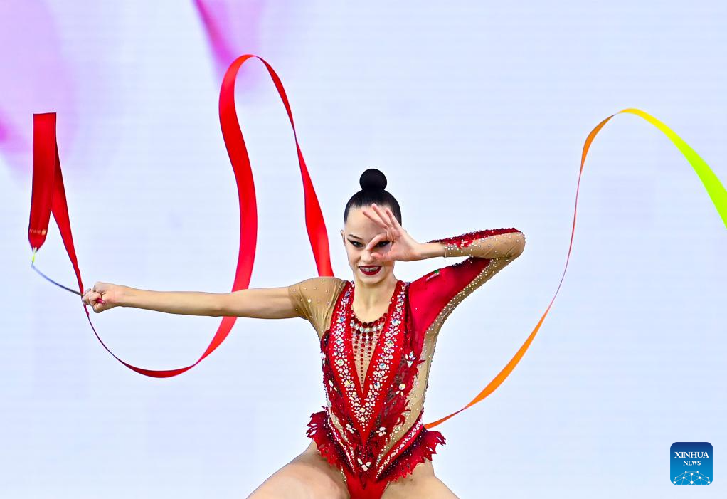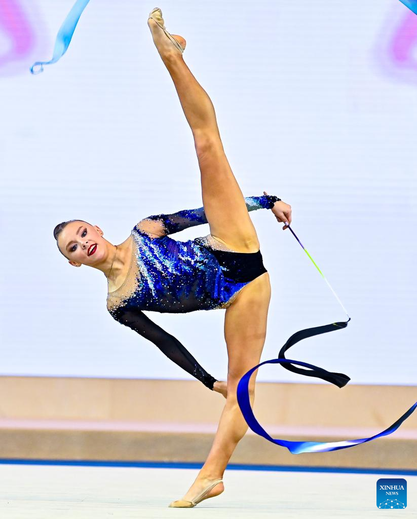 Daria Verenich of Belarus competes during the individual all-around qualifications at the 2024 International Rhythmic Gymnastics Tournament in Doha, Qatar, on Nov. 21, 2024. (Photo by Nikku/Xinhua)