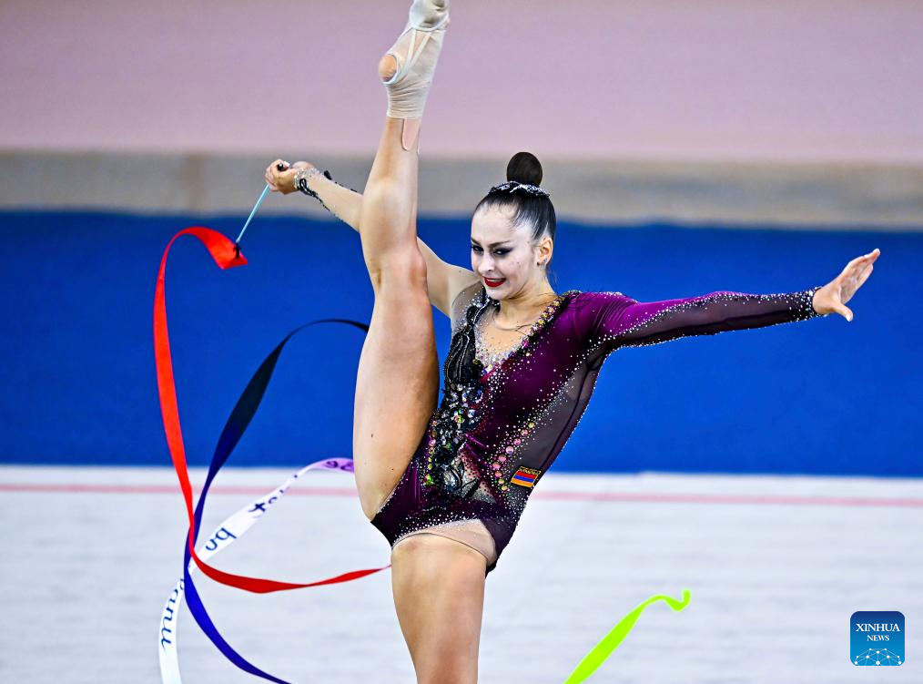 Silva Sargsyan of Armenia competes during the individual all-around qualifications at the 2024 International Rhythmic Gymnastics Tournament in Doha, Qatar, on Nov. 21, 2024. (Photo by Nikku/Xinhua)