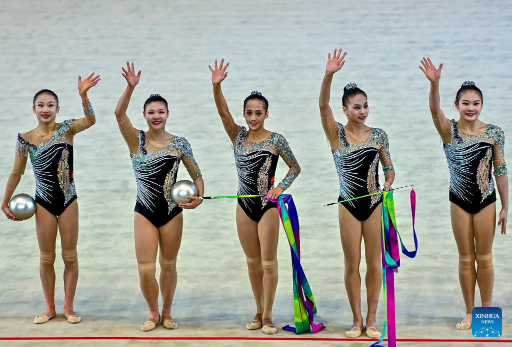 Team China greet the spectators during the group 3 ribbons and 2 balls final at the 2024 International Rhythmic Gymnastics Tournament in Doha, Qatar, on Nov. 22, 2024. (Photo by Nikku/Xinhua)