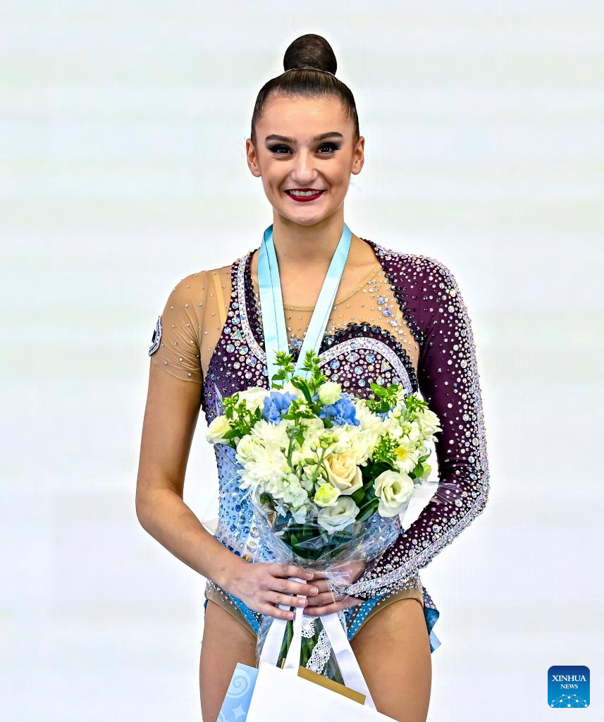 Gold medalist Alina Harnasko of Belarus react during the awarding ceremony for the individual hoop final at the 2024 International Rhythmic Gymnastics Tournament in Doha, Qatar, on Nov. 22, 2024. (Photo by Nikku/Xinhua)