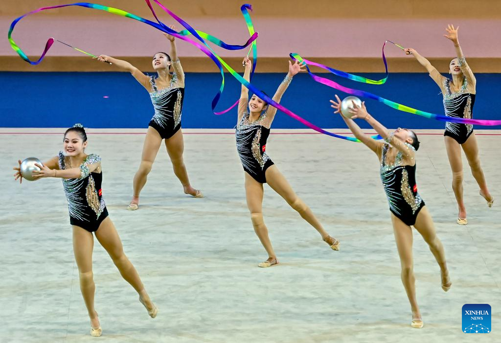 Team China compete during the group 3 ribbons and 2 balls final at the 2024 International Rhythmic Gymnastics Tournament in Doha, Qatar, on Nov. 22, 2024. (Photo by Nikku/Xinhua)