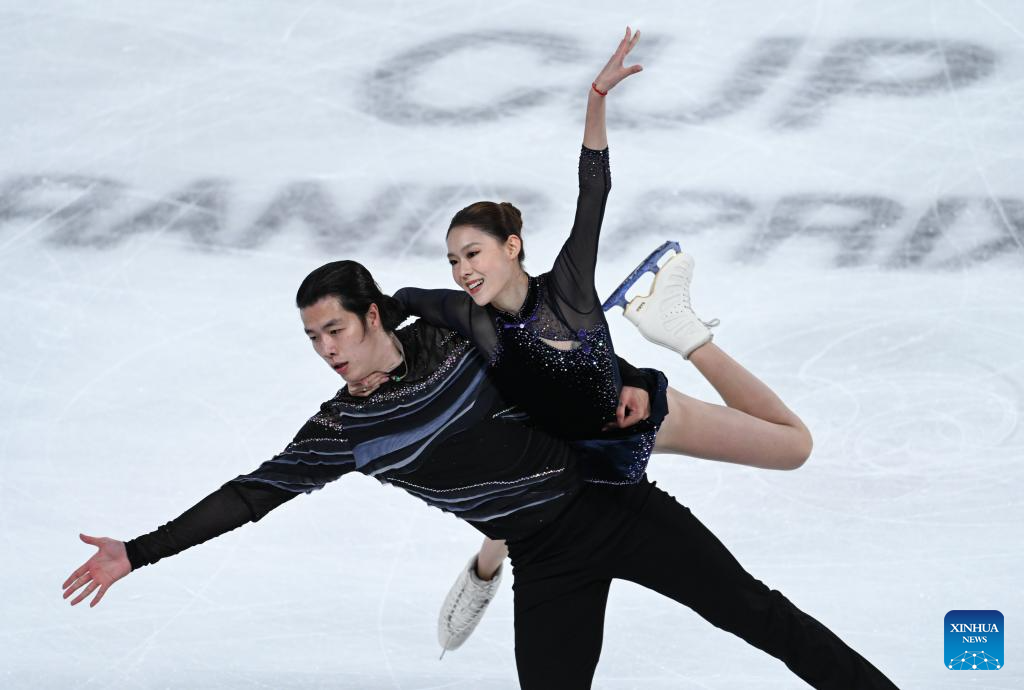 Wang Yuchen (R)/Zhu Lei of China perform during the pair skating free skating at the Cup of China ISU Grand Prix of Figure Skating 2024 in southwest China's Chongqing Municipality, Nov. 23, 2024. (Xinhua/Zhang Ziyu)