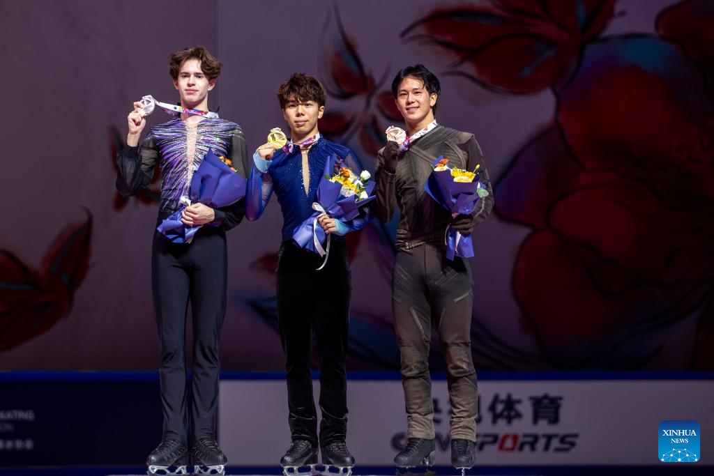 Gold medalist Sato Shun (C) of Japan, silver medalist Mikhail Shaidorov (L) of Kazakhstan and bronze medalist Adam Siao Him Fa of France pose during the awarding ceremony for the men's singles skating at the Cup of China ISU Grand Prix of Figure Skating 2024 in southwest China's Chongqing Municipality, Nov. 23, 2024. (Xinhua/Huang Wei)