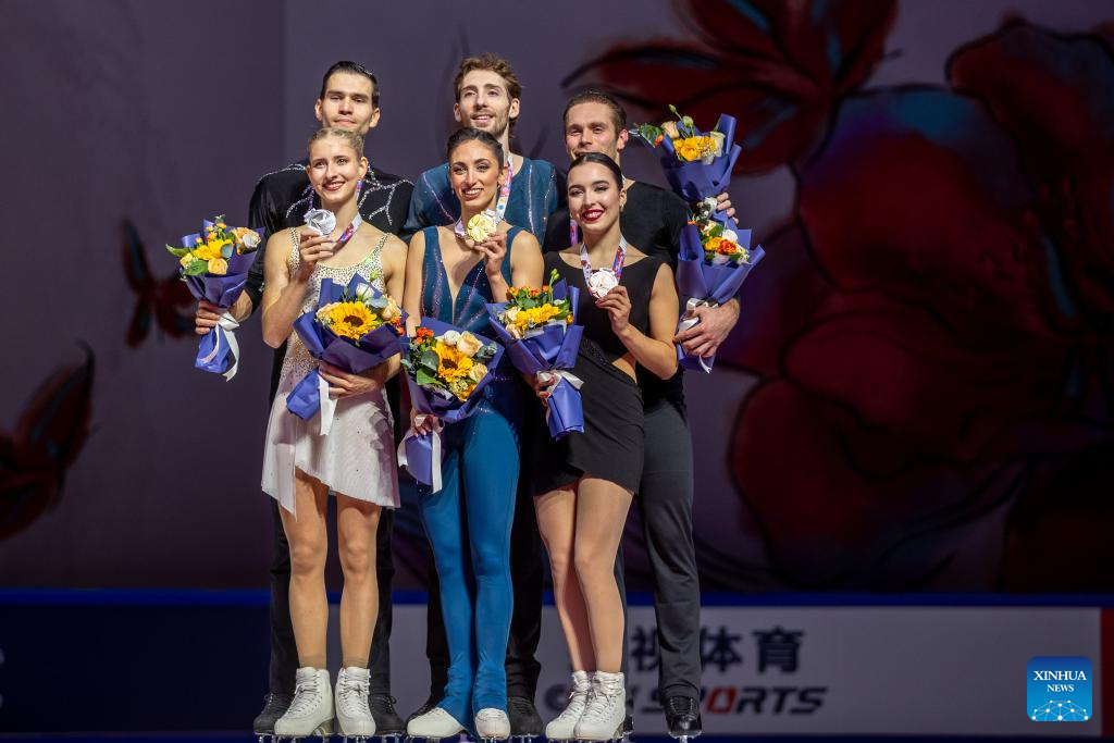 Gold medalists Charlene Guignard (3rd L)/Marco Fabbri (3rd R) of Italy, silver medalists Marjorie Lajoie (1st L)/Zachary Lagha (2nd L) of Canada and bronze medalists Christina Carreira/Anthony Ponomarenko (1st R) of the United States pose during the awarding ceremony for the ice dance at the Cup of China ISU Grand Prix of Figure Skating 2024 in southwest China's Chongqing Municipality, Nov. 23, 2024. (Xinhua/Huang Wei)