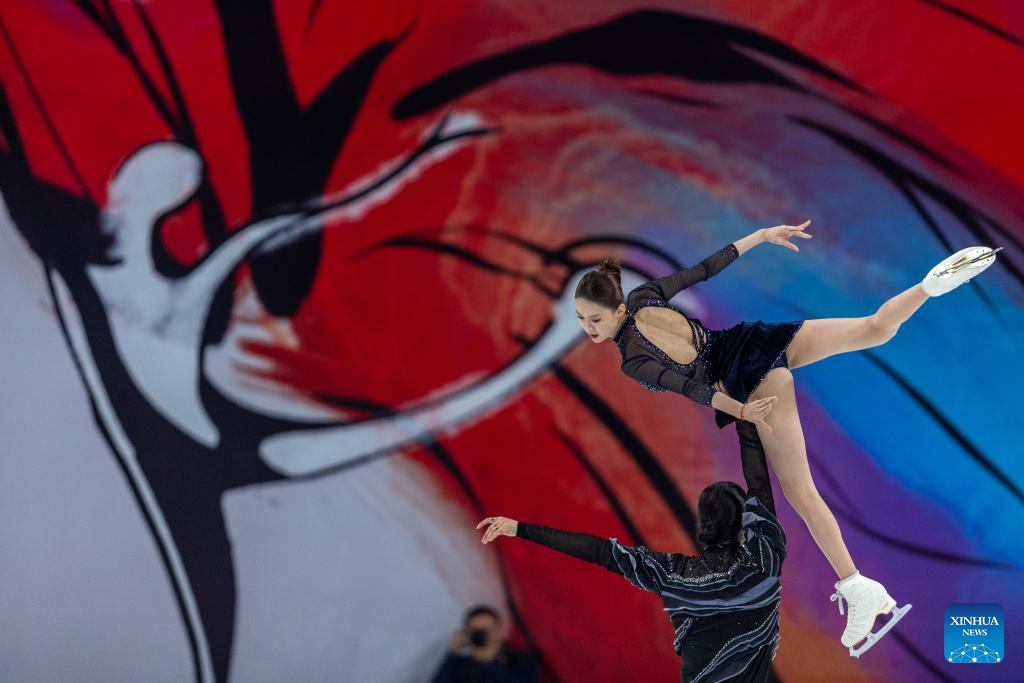 Wang Yuchen (top)/Zhu Lei of China perform during the pair skating free skating at the Cup of China ISU Grand Prix of Figure Skating 2024 in southwest China's Chongqing Municipality, Nov. 23, 2024. (Xinhua/Huang Wei)