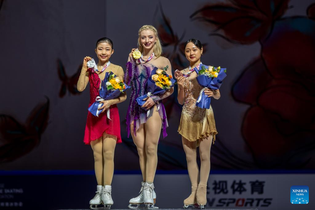 Gold medalist Amber Glenn (C) of the United States, silver medalist Chiba Mone (L) of Japan and bronze medalist Kim Chaeyeon of South Korea pose during the awarding ceremony for the women's singles skating at the Cup of China ISU Grand Prix of Figure Skating 2024 in southwest China's Chongqing Municipality, Nov. 23, 2024. (Xinhua/Huang Wei)