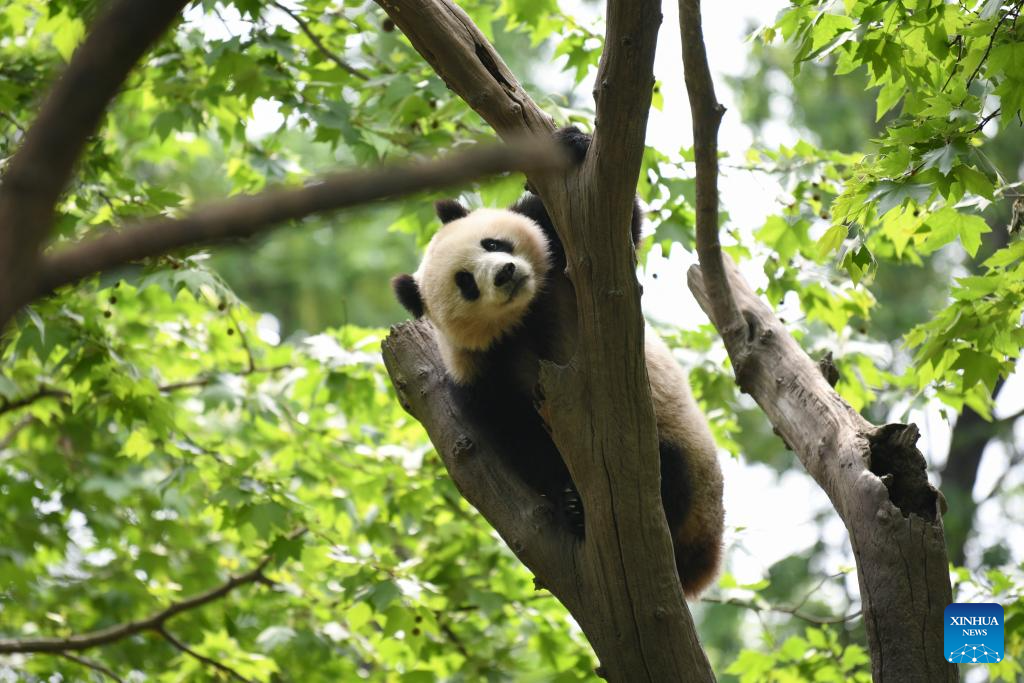Giant panda Le Le frolics on a tree branch at the Dujiangyan base of the China Conservation and Research Center for the Giant Panda in Chengdu, southwest China's Sichuan Province, April 19, 2024. Le Le, male, was born at the River Wonders wildlife park in Singapore on Aug. 14, 2021.