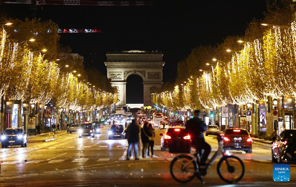 The Champs-Elysees is lit by Christmas holiday lights in Paris, France, Nov. 24, 2024. The annual Christmas season lighting ceremony was held here on Sunday. (Xinhua/Gao Jing)