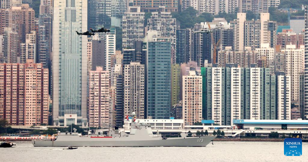 The Changsha missile destroyer leaves the dock of Stonecutters Island in Hong Kong, south China, Nov. 25, 2024. A Chinese People's Liberation Army Navy fleet comprising the Hainan amphibious assault ship and the Changsha missile destroyer visited Hong Kong from Nov. 21 to 25. (Photo by Yi Ding/Xinhua)