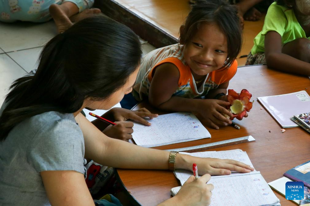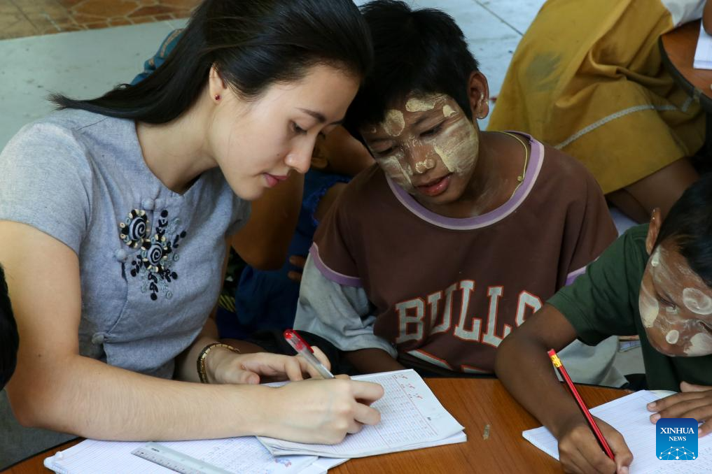 A local teacher tutors street kids at a monastery compound in Yangon, Myanmar, Nov. 24, 2024. (Xinhua/Myo Kyaw Soe)