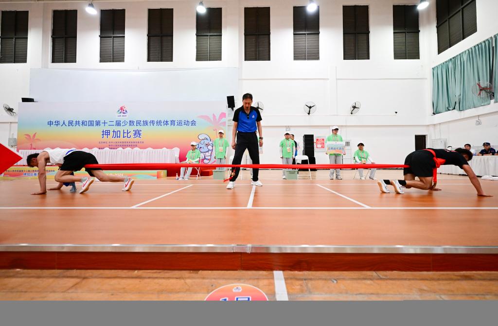 SANYA, China, Nov. 27 (Xinhua) -- As the referee's whistle echoed through the arena, Lien Te-An braced himself. Facing away from his opponent, with the red silk strap wrapped around his body, he pushed forward with all his strength to pull the ribbon over the victory line.