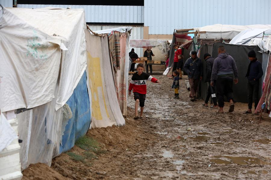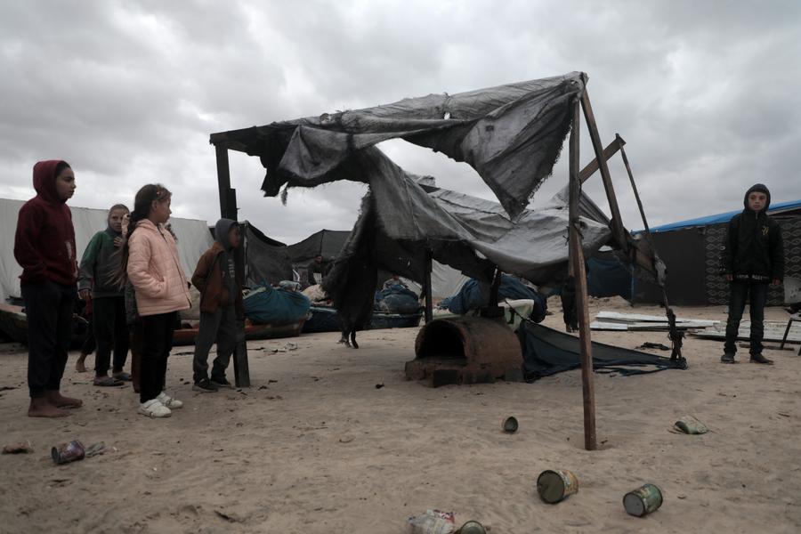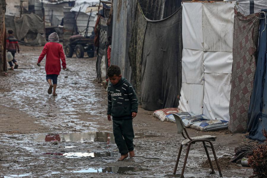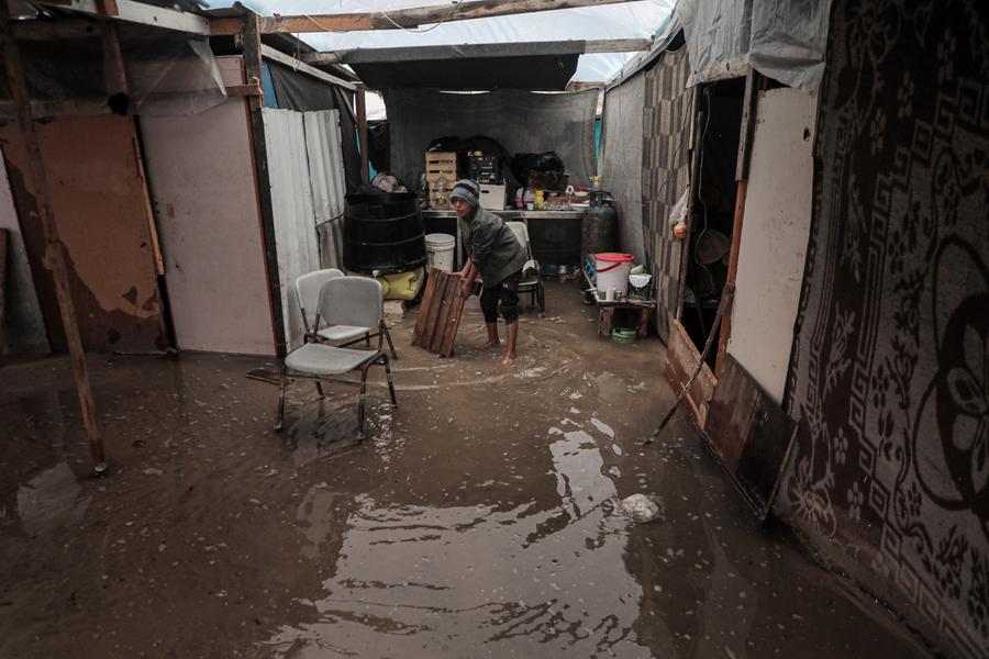 GAZA, Nov. 27 (Xinhua) -- "We fled the Israeli shelling and death in Gaza, but now we are drowning in rain and seawater," lamented Abbas Lafi, a displaced Palestinian now residing in Khan Younis.