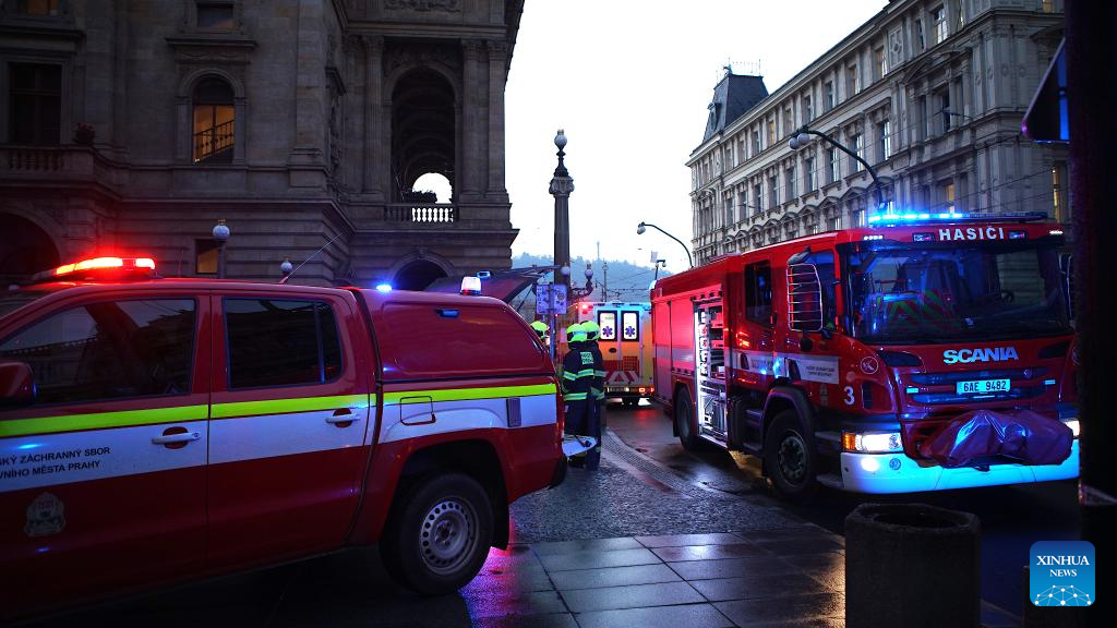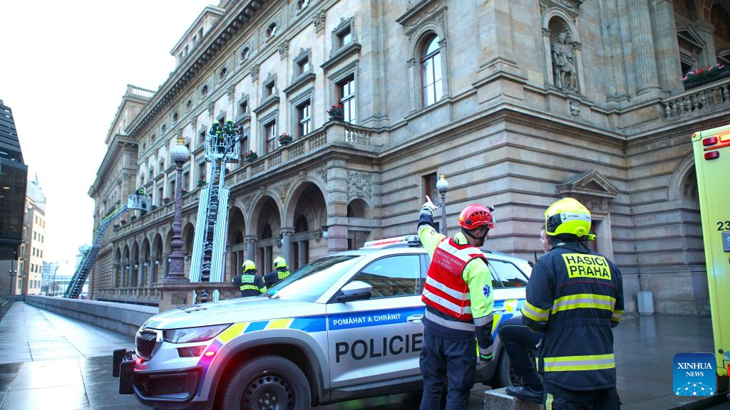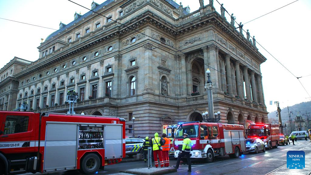 Emergency vehicles are seen near the National Theater in Prague, the Czech Republic, on Nov. 26, 2024. Prague firefighters successfully extinguished a fire that broke out on Tuesday afternoon in the historic National Theater building, a landmark in the Czech capital. (Photo by Dana Kesnerova/Xinhua)