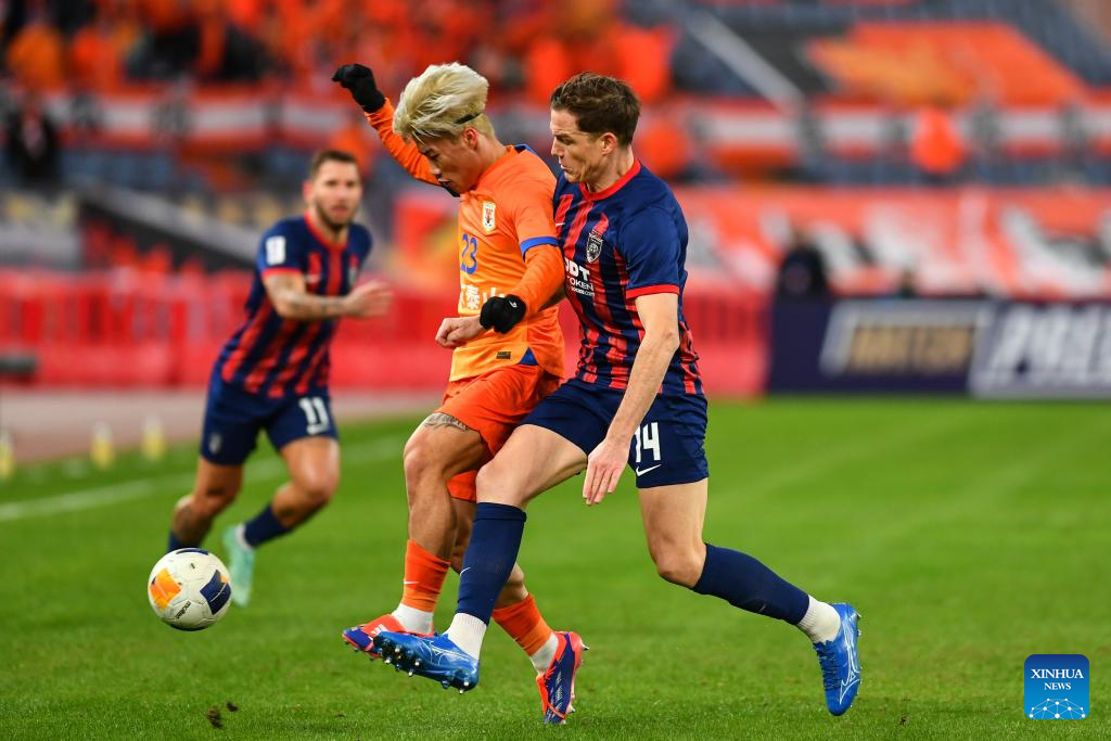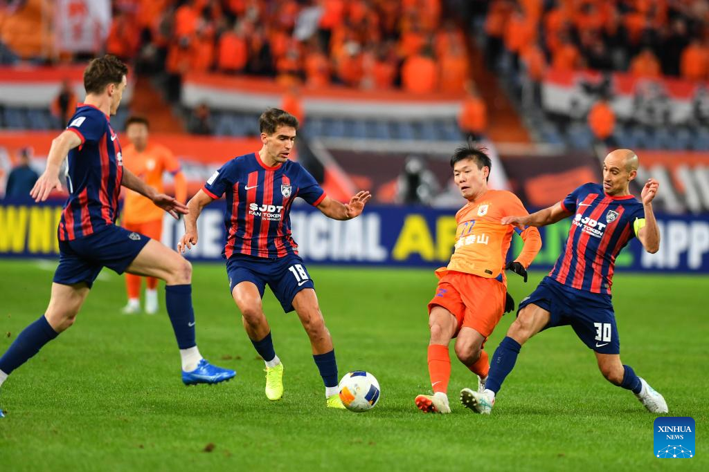 Cryzan (2nd R) of Shandong Taishan FC competes during the AFC Champions League elite football match between Shandong Taishan FC of China and Johor Darul Ta'zim of Malaysia in Jinan, east China's Shandong Province, Nov. 26, 2024. (Xinhua/Zhu Zheng)