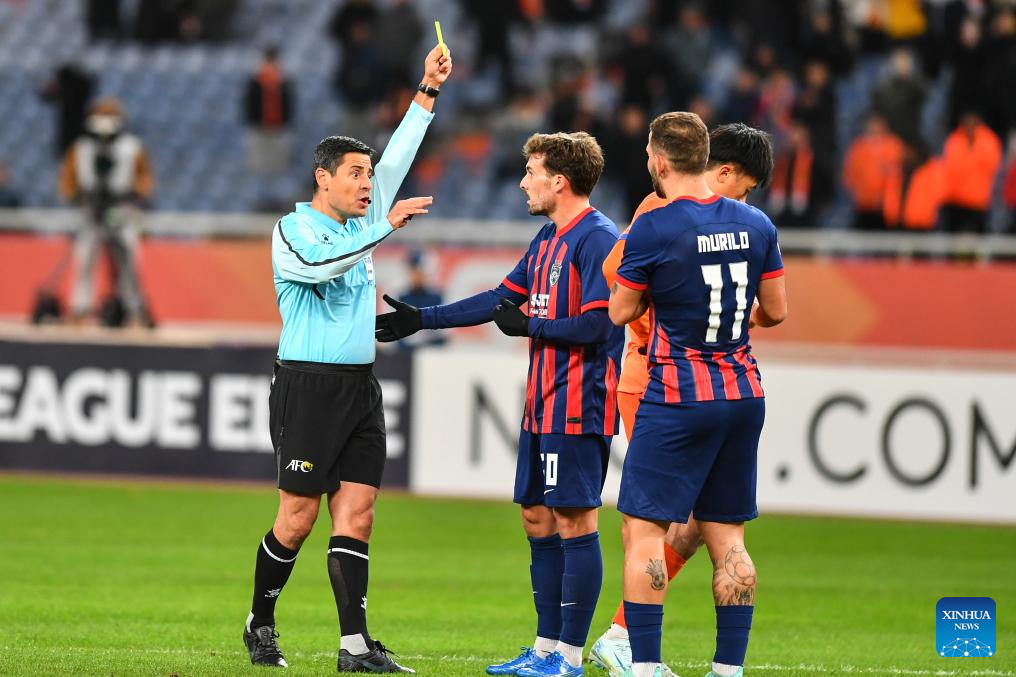 Juan Muniz (2nd L) of Johor Darul Ta'zim receives a yellow card during the AFC Champions League elite football match between Shandong Taishan FC of China and Johor Darul Ta'zim of Malaysia in Jinan, east China's Shandong Province, Nov. 26, 2024. (Xinhua/Zhu Zheng)