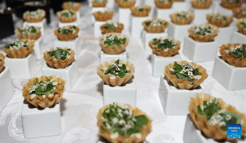 Snacks from a Portugal restaurant are presented at the unveiling ceremony of LA LISTE 2025 world restaurant ranking at the French Ministry of Foreign Affairs in Paris, France, Nov. 25, 2024. LA LISTE 2025, the latest update of a list of the best global restaurants, was unveiled here on Monday. (Xinhua/Gao Jing)
