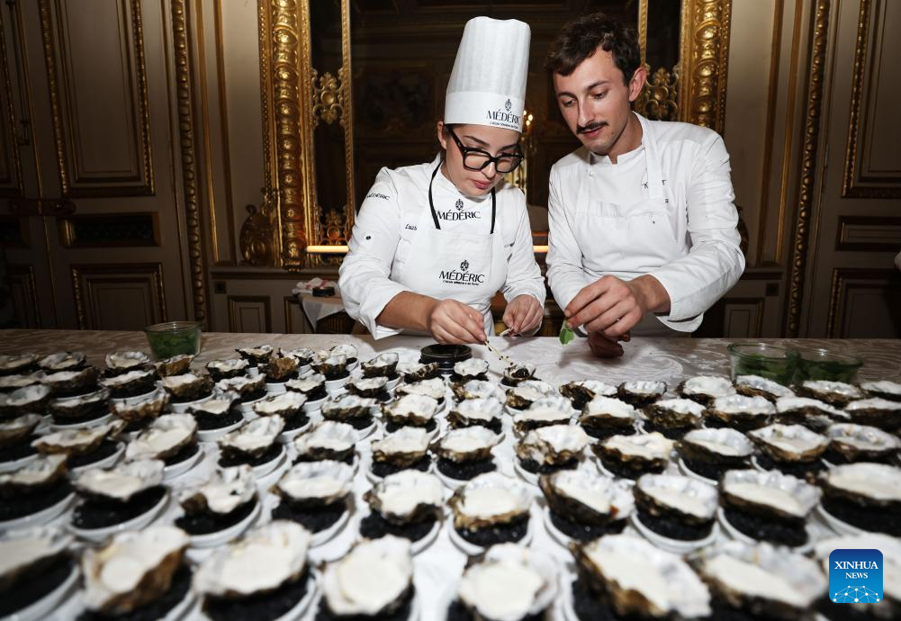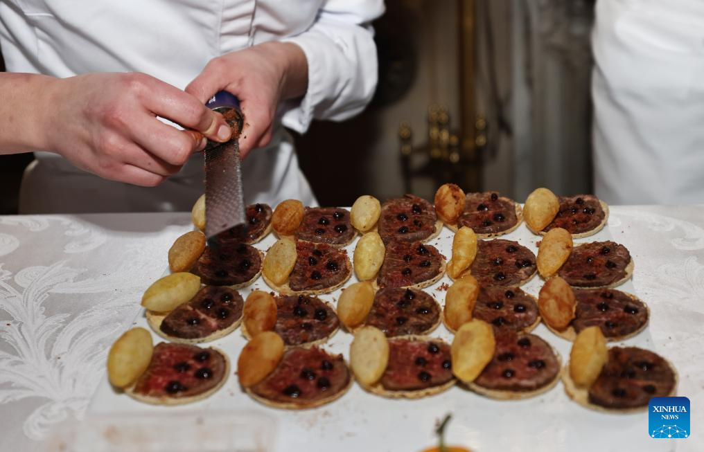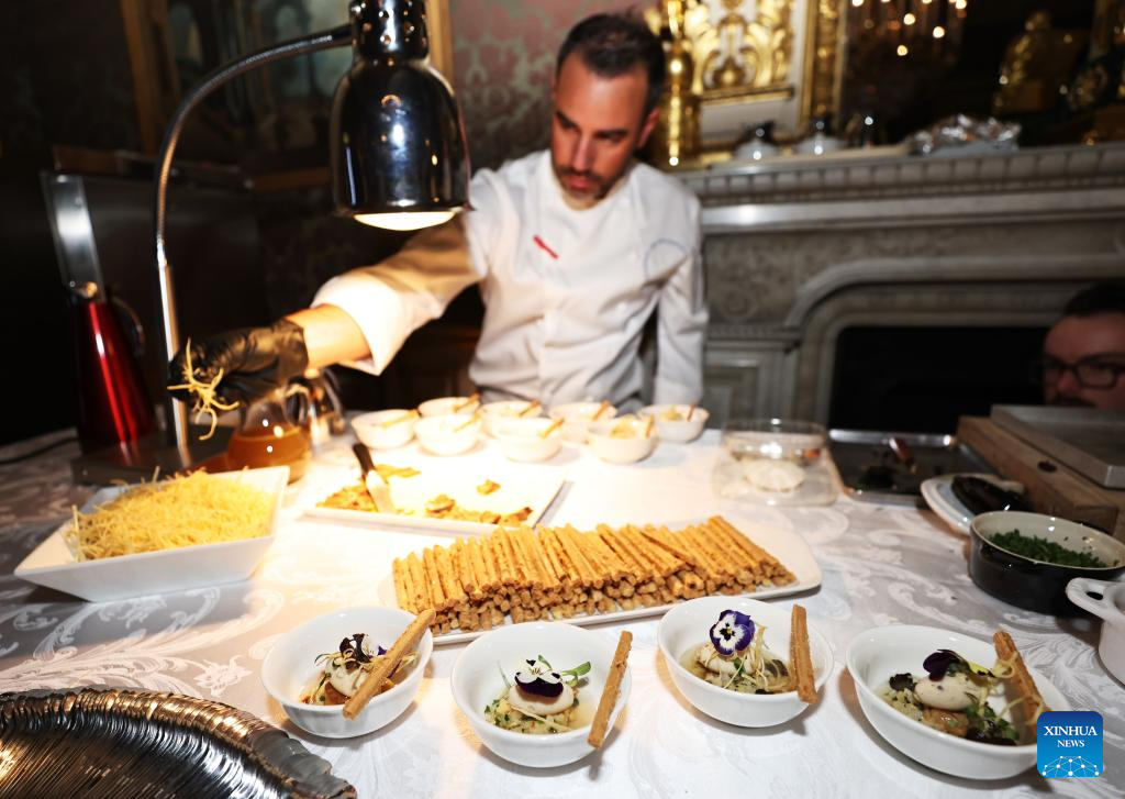 A French chef prepares snacks at the unveiling ceremony of LA LISTE 2025 world restaurant ranking at the French Ministry of Foreign Affairs in Paris, France, Nov. 25, 2024. LA LISTE 2025, the latest update of a list of the best global restaurants, was unveiled here on Monday. (Xinhua/Gao Jing)