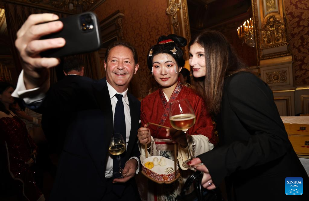 Guests take a selfie with a Chinese staff member after tasting famous Chinese royal court pastries from Fangshan Restaurant, located in the historic Beihai Park in Beijing, at the unveiling ceremony of LA LISTE 2025 world restaurant ranking at the French Ministry of Foreign Affairs in Paris, France, Nov. 25, 2024. LA LISTE 2025, the latest update of a list of the best global restaurants, was unveiled here on Monday. (Xinhua/Gao Jing)
