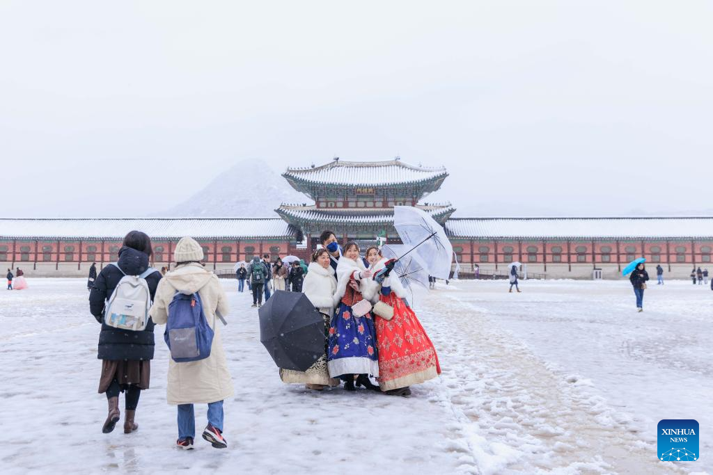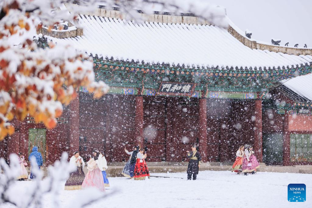 This photo taken on Nov. 27, 2024 shows people posing for photos in snow in Seoul, South Korea. South Korea's capital city logged a record November snowfall, with more than 16 cm of snow blanketing Seoul, the weather service said Wednesday. (Photo by Park Jintaek/Xinhua)