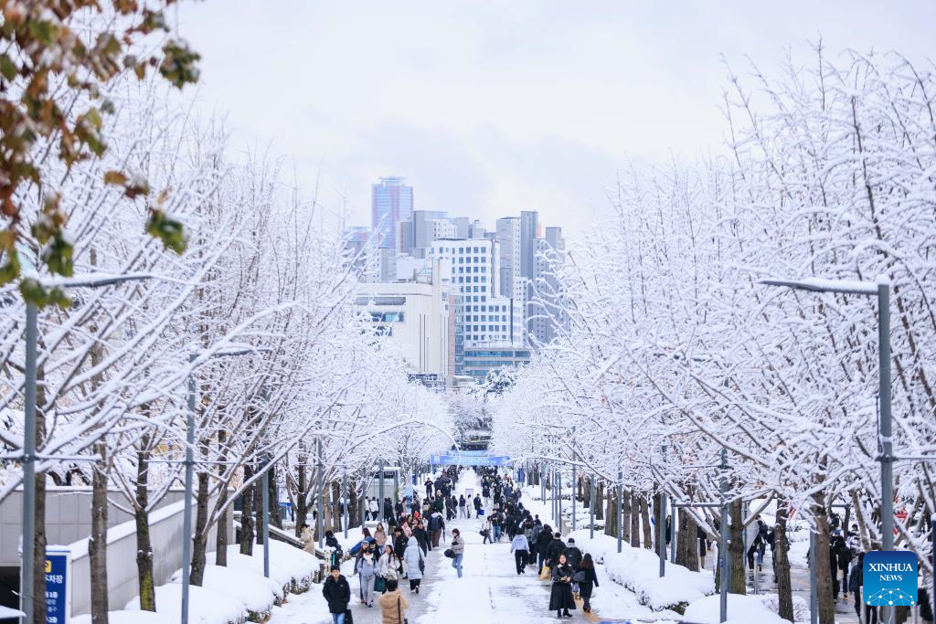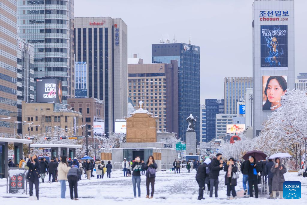 This photo taken on Nov. 27, 2024 shows people enjoying the view in snow in Seoul, South Korea. South Korea's capital city logged a record November snowfall, with more than 16 cm of snow blanketing Seoul, the weather service said Wednesday. (Photo by Park Jintaek/Xinhua)