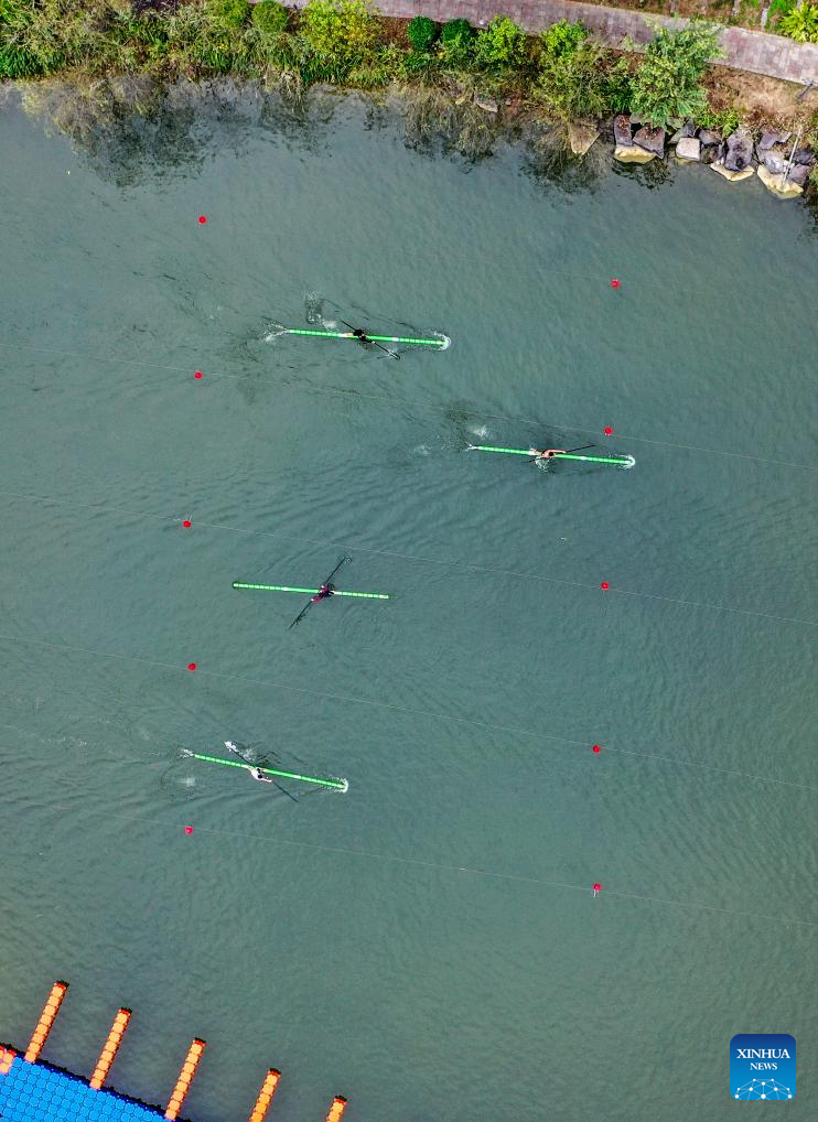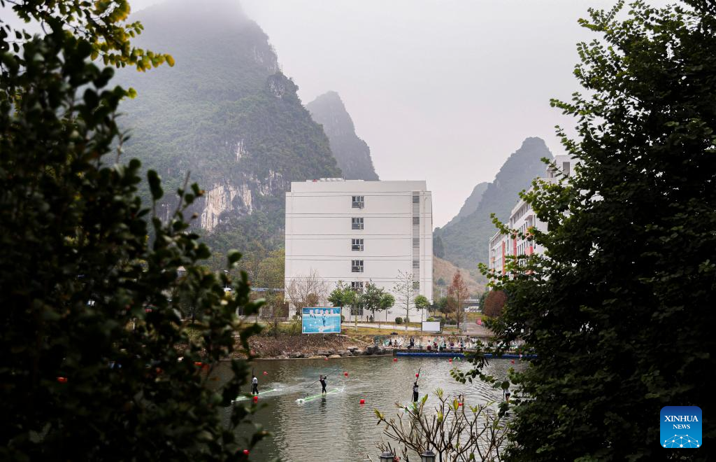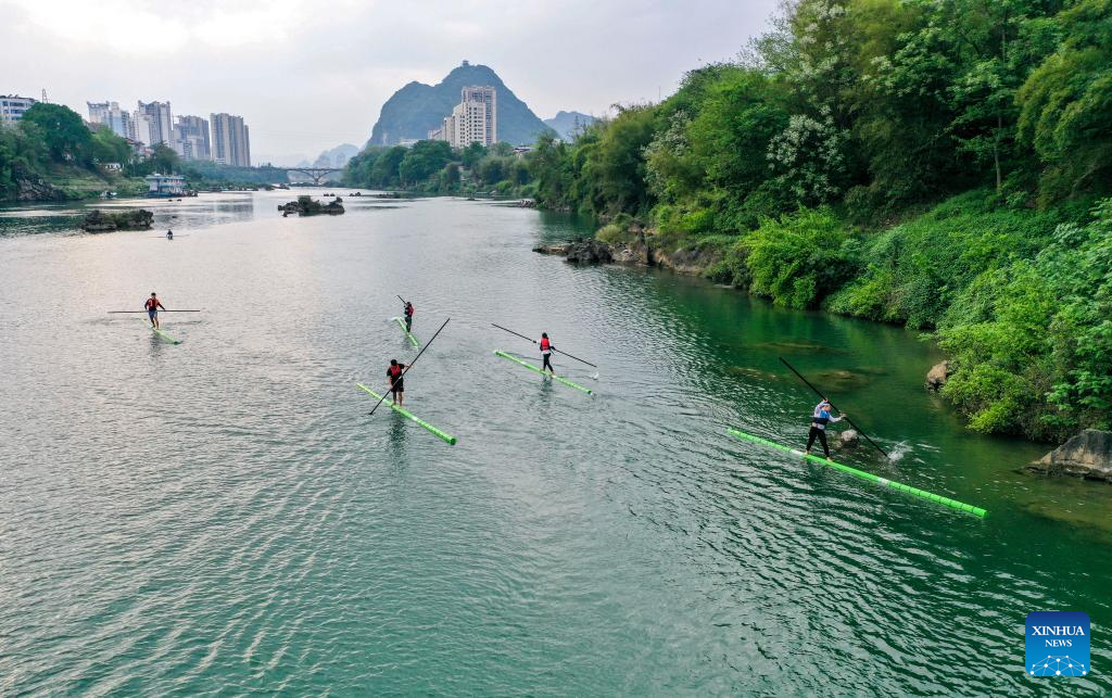 The members of the single bamboo drifting team of Hechi University practice at the training place of the university in Hechi City, south China's Guangxi Zhuang Autonomous Region, Jan. 9, 2024. (Xinhua/Hu Xingyu)
