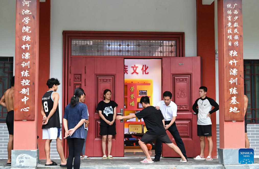 Lan Jianzhuo (R), dean of the Institute of Physical Education of Hechi University, watchs a member of the single bamboo drifting team practicing in Hechi City, south China's Guangxi Zhuang Autonomous Region, June 19, 2024. (Xinhua/Cao Yiming)