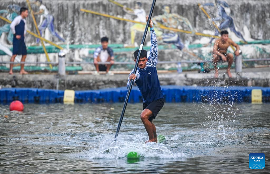 Lu Chuntao of Team Guangxi competes during the women's 200m race of single bamboo drifing at the 12th National Traditional Games of Ethnic Minorities of China in Sanya, south China's Hainan Province, Nov. 28, 2024. (Xinhua/Cao Yiming)
