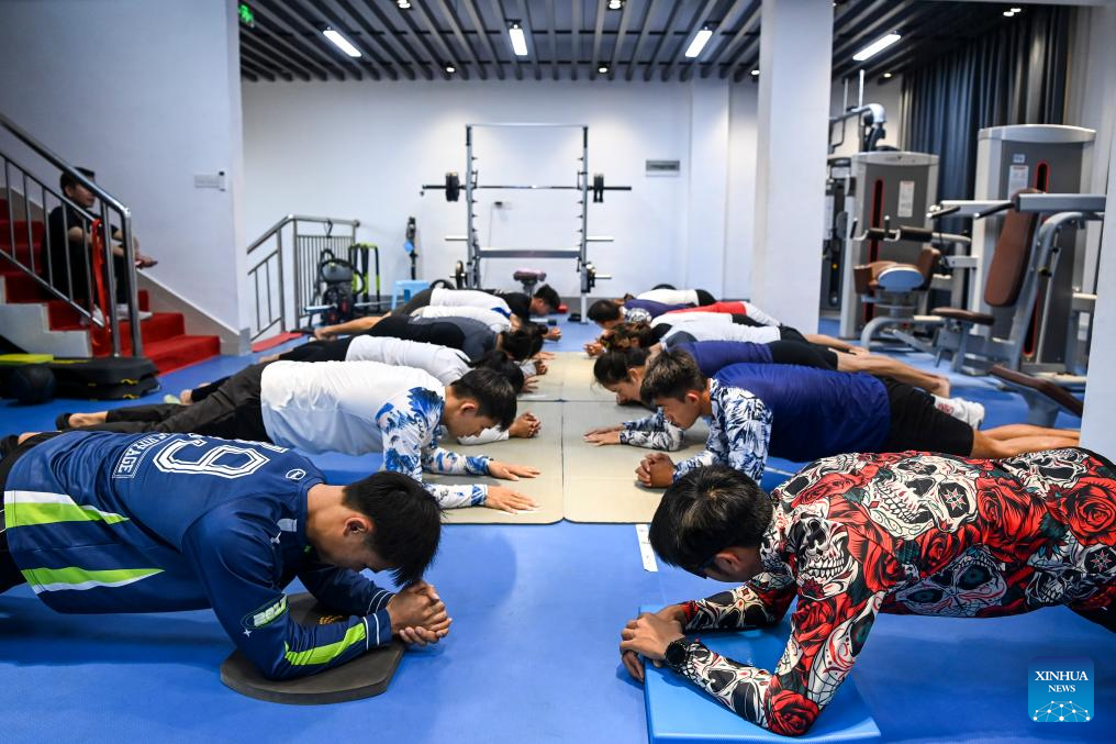 The members of the single bamboo drifting team of Hechi University attend a training session at a gym in Hechi City, south China's Guangxi Zhuang Autonomous Region, Nov. 14, 2024. (Xinhua/Cao Yiming)